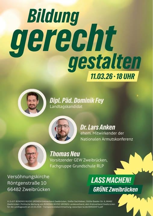 Als Gesprächspartner konnten wir gewinnen: Dr. Lars Anken, ehemaliger Mitwirkender der nationalen Armutskonferenz und ausgewiesener Kenner des Bildungssystems, Thomas Neu, Mitglied des Leitungsteams der Fachgruppe Grundschule der Gewerkschaft Erziehung und Wissenschaft Rheinland-Pfalz, sowie Diplom-Pädagoge Dominik Fey, Landtagskandidat von Bündnis 90/Die Grünen für den Wahlkreis Zweibrücken. Die Diskussion wird sich mit der Frage beschäftigen, wie soziale Ungleichheiten den Bildungserfolg beeinflussen und welche politischen Weichenstellungen notwendig sind, um allen Kindern und Jugendlichen unabhängig von ihrer Herkunft gleiche Chancen zu ermöglichen.
