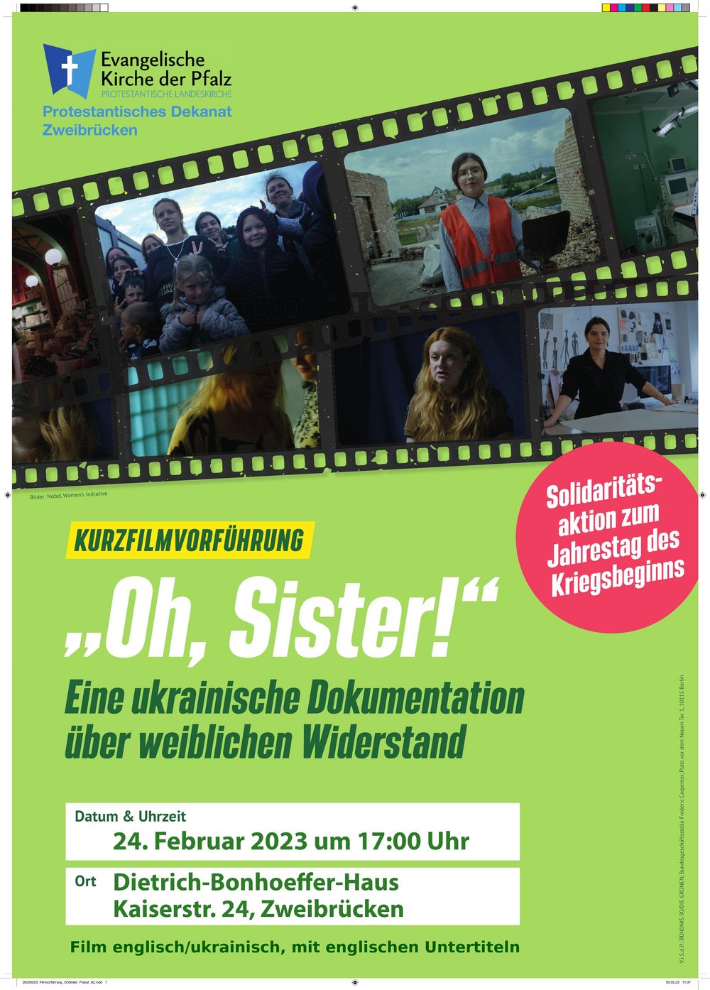 Am 24. Februar ist seit 365 Tagen Krieg in der Ukraine. An diesem Tag möchten wir innehalten und den Blick auf die Ukraine - und insbesondere ihre mutigen, unbeugsamen Frauen richten. Dazu zeigen wir den Film „Oh sister!“ der Filmemacherin Hanna Kopylova. Darin begleitet sie drei Friedensnobelpreisträgerinnen (Jody Williams, USA 1987, Tawakkol Karman, Jemen 2011 und Leymah Gbowee, Liberien 2011) auf ihrer Reise vom polnischen Krakau bis ins ukrainische Lemberg.