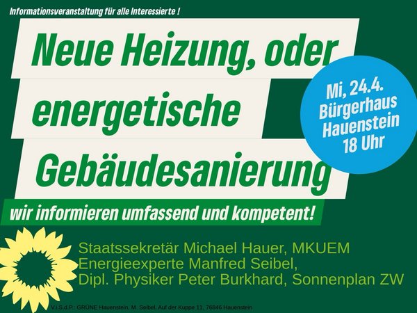 Viele Fragen, auf die Michael Hauer (Staatssekretär im Ministerium für Klimaschutz, Umwelt, Energie und Mobilität), Manfred Seibel (Kreisbeigeordneter und Energie-Fachmann), sowie Peter Burkhard (Dipl.-Physiker und Geschäftsführer der Fa. Sonnenplan, Zweibrücken) Antworten geben. Und zwar am Mittwoch, 24. April 2024, ab 18 Uhr, im Bürgerhaus Hauenstein.