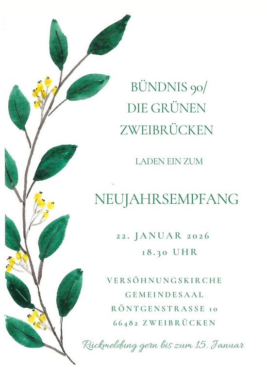 Am Donnerstag, 22. Januar 2026, um 18.30 Uhr lädt der Kreisverband Zweibrücken von Bündnis 90/Die Grünen ein zu seinem Neujahrsempfang. Er findet statt im Gemeindesaal der Versöhnungskirche Zweibrücken, Röntgenstraße 10.