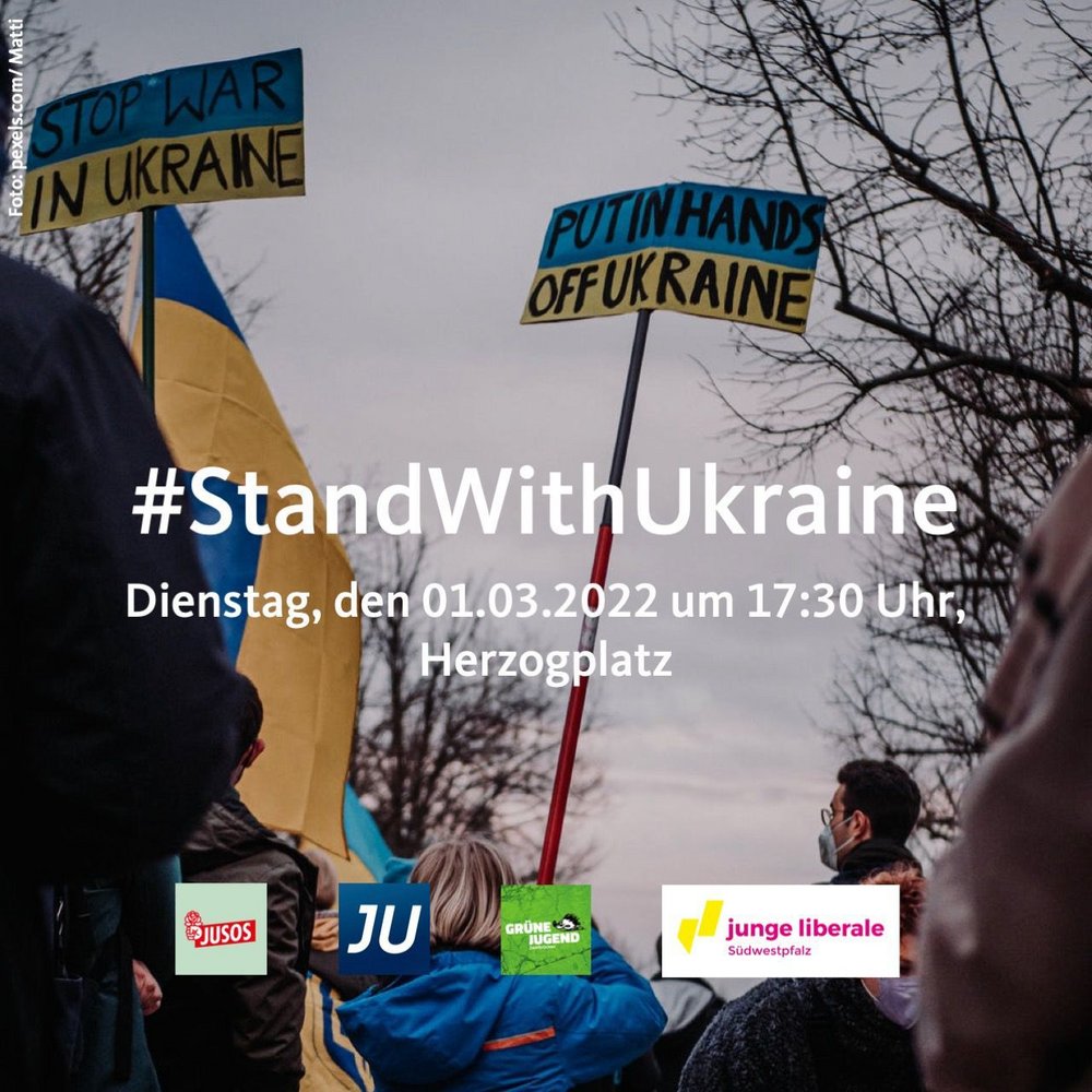 Heute fand auf dem Zweibrücker Herzogplatz eine gemeinsame Kundgebung der Grünen Jugend Zweibrücken mit der Jungen Union Zweibrücken, den Jusos Zweibrücken und den Jungen Liberalen Südwestpfalz zur Solidarisierung mit der Ukraine und Bekundung gegen den Krieg statt.