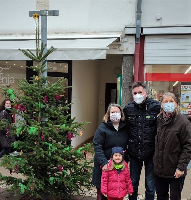 Auch 2021 beteiligt sich der GRÜNE Kreisverband gern an der Aktion. Am vergangenen Samstag hängten die Familie Lang und Kreisschatzmeisterin Dagmar Pohlmann gemeinsam selbstgebastelten Schmuck (wie gehäkelte Sisal-Sterne, Sisal-Schleifen, Sterne aus getrocknete Orangenschalen und Kiefernzapfen an zwei Bäumchen in der Fußgängerzone. Es hat allen Spaß gemacht, und die Hoffnung geweckt, der adventliche Gruß möge in jeder Beziehung nachhaltig sein.