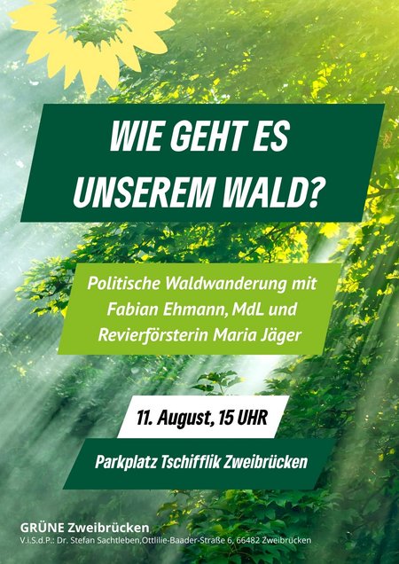 Zu einer Waldwanderung mit unserem Landtagsabgeordneten Fabian Ehmann und Revierförsterin Maria Jäger lädt der Grüne Kreisverband Zweibrücken am kommenden Montag, 11. August, ein. Los geht’s um 15 Uhr auf dem Parkplatz Tschifflick (beim Bahnhaltepunkt Tschifflick, https://maps.app.goo.gl/sHHDY9AdL3WuFCyH7). Die kleine Wanderung dauert etwa anderthalb Stunden und führt durch den Stadtwald innerhalb der Mauer zur Fasanerie, von dort durch den Wald oberhalb des Wildrosengartens und zurück zum Parkplatz. Bei Interesse können kann sie im „Landhaus“ ausklingen.