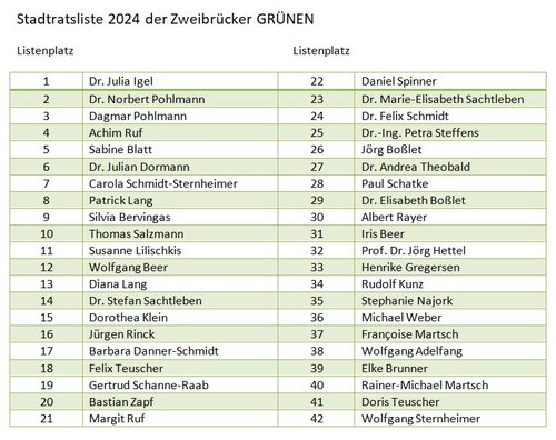 Eine Überraschung bedeutet das bei den GRÜNEN nicht; für viele überraschend erschienen jedoch die Kandidaturen von Julian Dormann, der bis zur Jahresmitte Kämmereileiter der Stadt Zweibrücken war, und Thomas Salzmann, der bis zum Eintritt in die Altersteilzeit als Redakteur bei der RHEINPFALZ arbeitete und der die Stadtpolitik nun aus einer anderen Perspektive mittragen möchte.